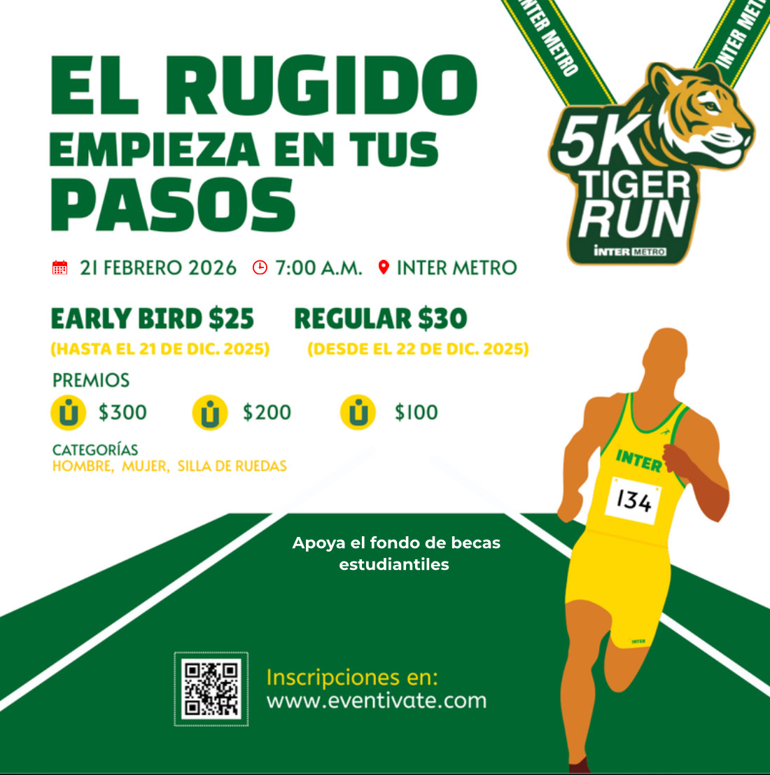 Corre o camina el 5k del Tiger Run en la Inter Metro. Daremos un recorrido alrededor del Recinto Universitario en las que nos acompañarán miembros y amigos de la comunidad universitaria. Tendremos la ruta del 5k para todo público y una ruta especial para los adultos mayores. Al finalizar la carrera tendremos un fin de fiesta en el Centro de Estudiantes y exhibición de productos de empresarios universitarios.