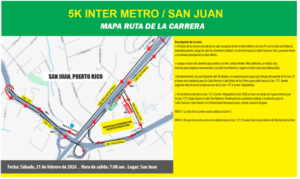 El inicio de la Carrera sería desde la calle marginal (entre la Inter Metro y la Carr #1) en la Calle San Roberto, inmediatamente los corredores doblan hacia la Calle Francisco Sein pasando por frente a la entrada de la Inter y luego hacen otra derecha para la Ave Lomas Verde. Luego, realizan otra derecha para entrar nuevamente a la Calle San Roberto y seguir directo hacia Monacillos. Posteriormente, doblan a la izquierda para pasar por debajo de la Carr. #1 y hacer otra izquierda para la Calle Alonso (OASIS) y Calle Reina de las Flores para subir hacia la Carr. 177, donde doblarán a la derecha. En la intersección de la Carr. 177 y la Ave. Alejandrino (Carr. 838) se hace un viraje en U para retornar por la Carr. 177 (OASIS) y bajar hacia la Calle San Roberto. Finalmente, los corredores doblan a la derecha para la Calle Francisco Sein (frente a la Universidad Interamericana), donde estará la llegada.