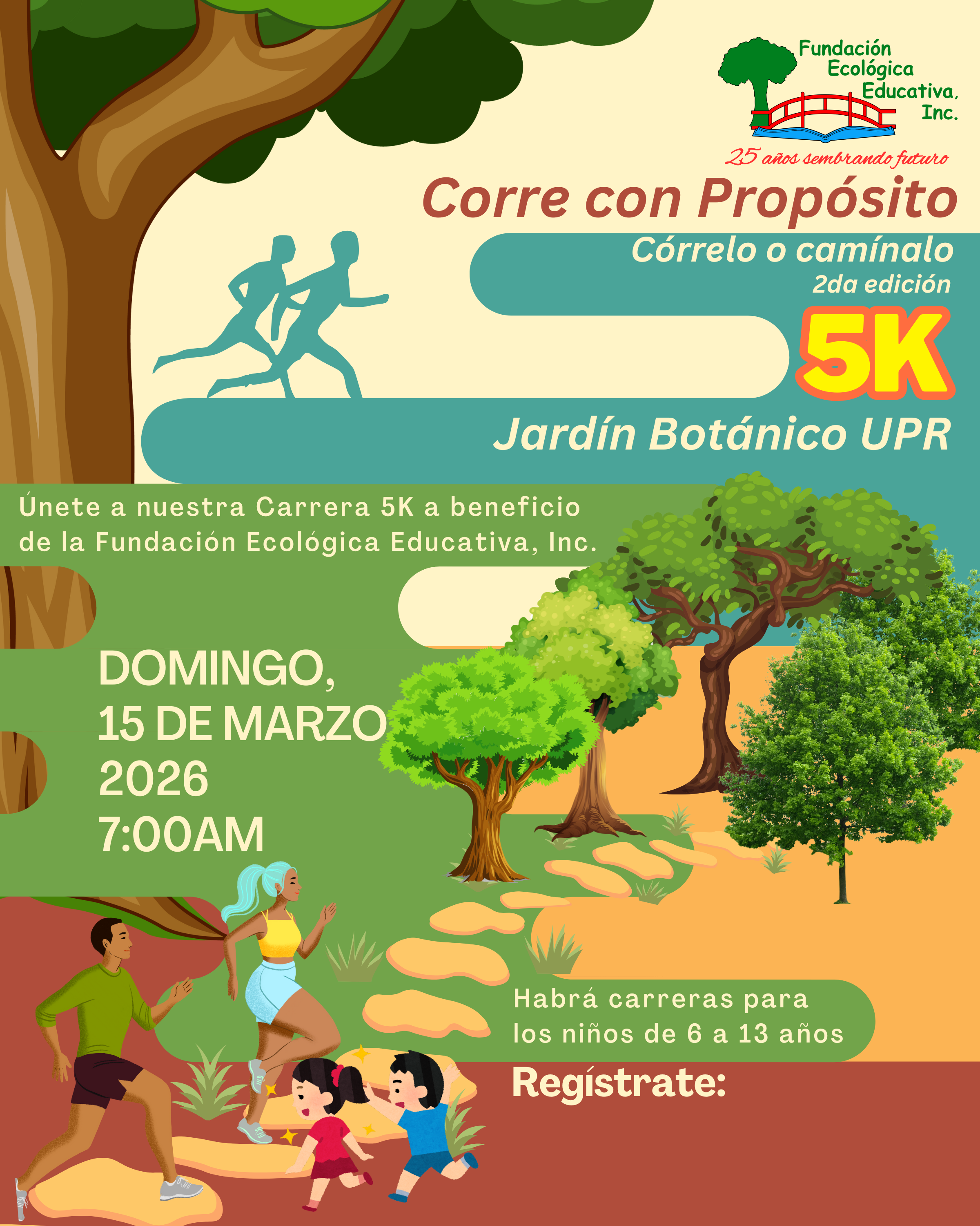La Fundación Ecológica Educativa, Inc. estará celebrando su segundo 5K Jardín Botánico UPR el 15 de marzo de 2026 a las 7:00 a.m. y las Carreras Infantiles en el Jardín Botánico de Río Piedras.