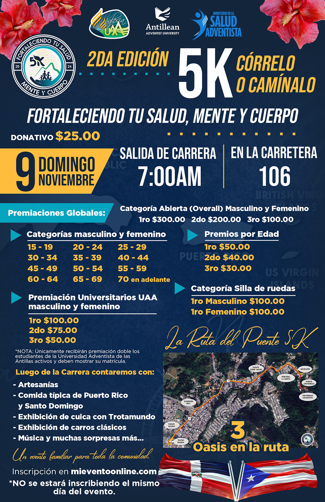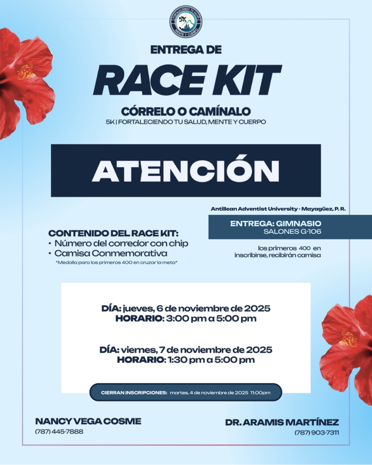 🚨 Todos los participantes del 5k deben de llegar a las 5:00 am a los predios de la Universidad Adventista de las Antillas para poder estacionarse en los lugares asignados. 🚨
