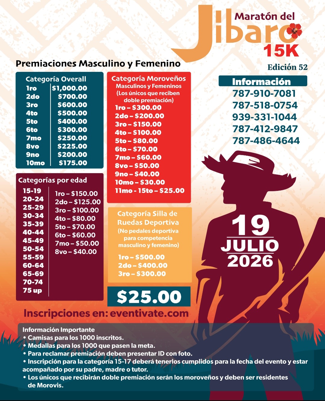 Se parte de la edición 2026 de nuestro tradicional Maratón del Jíbaro 15kms. Tendremos premiaciones por categoría, silla de ruedas y moroveños.