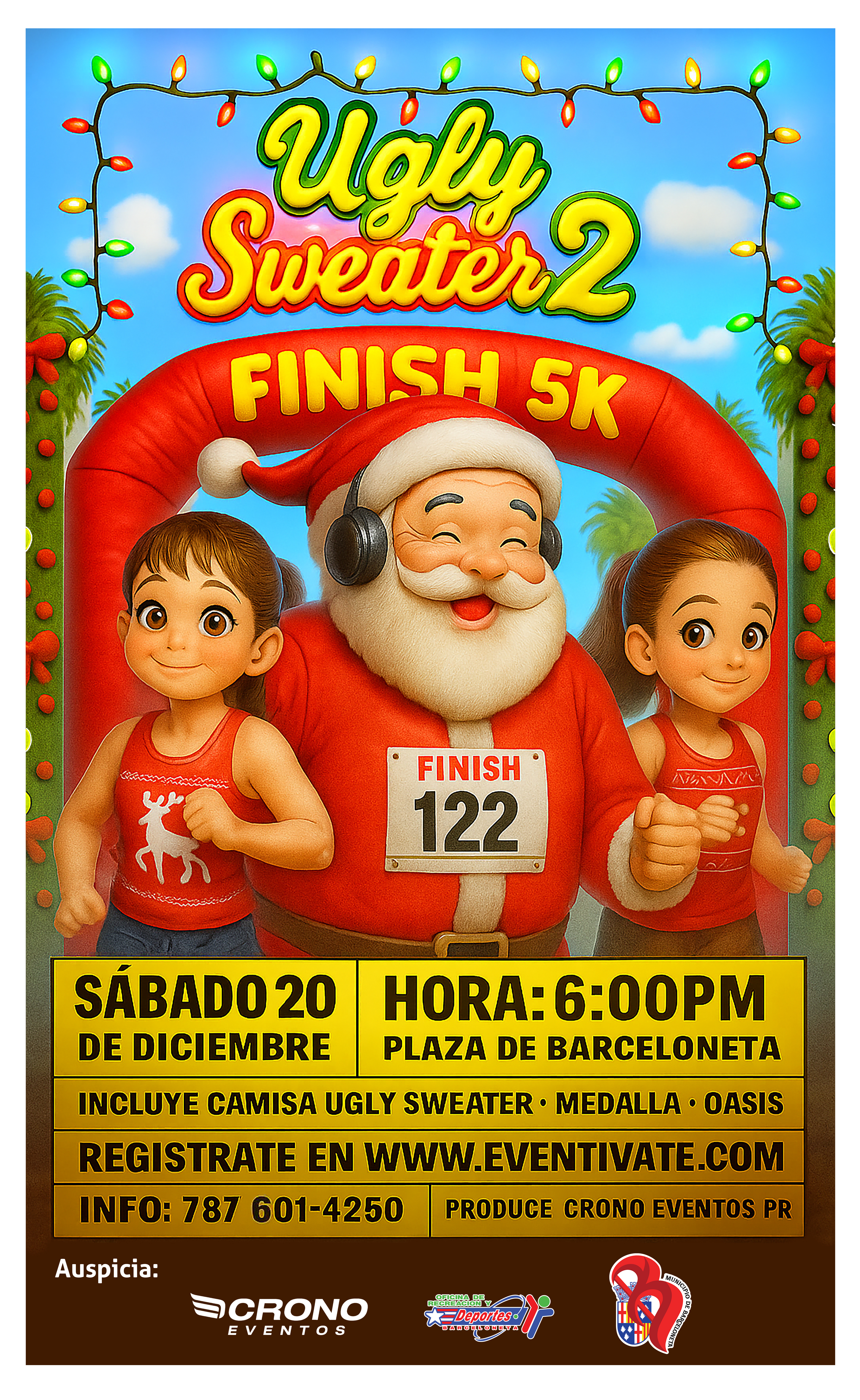 Llega la segunda edición del 5K Ugly Sweater 🎅, con Santa Claus en su trineo — una experiencia única que mezcla la pasión por correr con el ambiente festivo de la Navidad boricua. Ven con embelecos junto a tus amigos o familia, y disfruta de una tarde llena de música, luces y alegría en la Plaza Pública de Barceloneta, transformada en un espectacular Mercado Navideño. Y cuando cruces la meta… prepárate para un “After Run ❄️ Nieve Party” y el PARRANDAZO Navideño como solo Barceloneta sabe hacerlo. No se requiere experiencia previa — ¡solo ganas de pasarla bien! Se recomienda llegar temprano para disfrutar del Mercado Navideño. Cupos limitados.